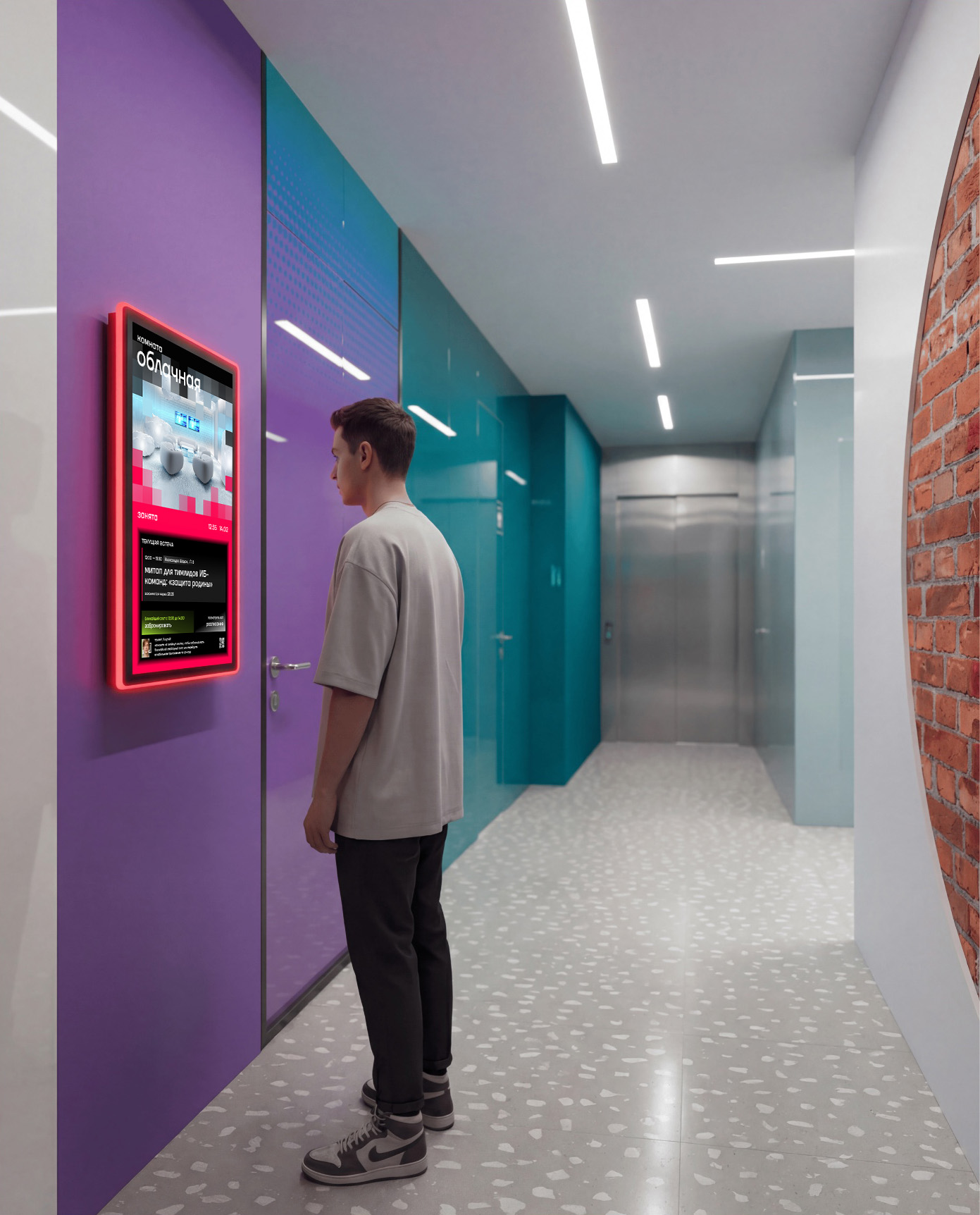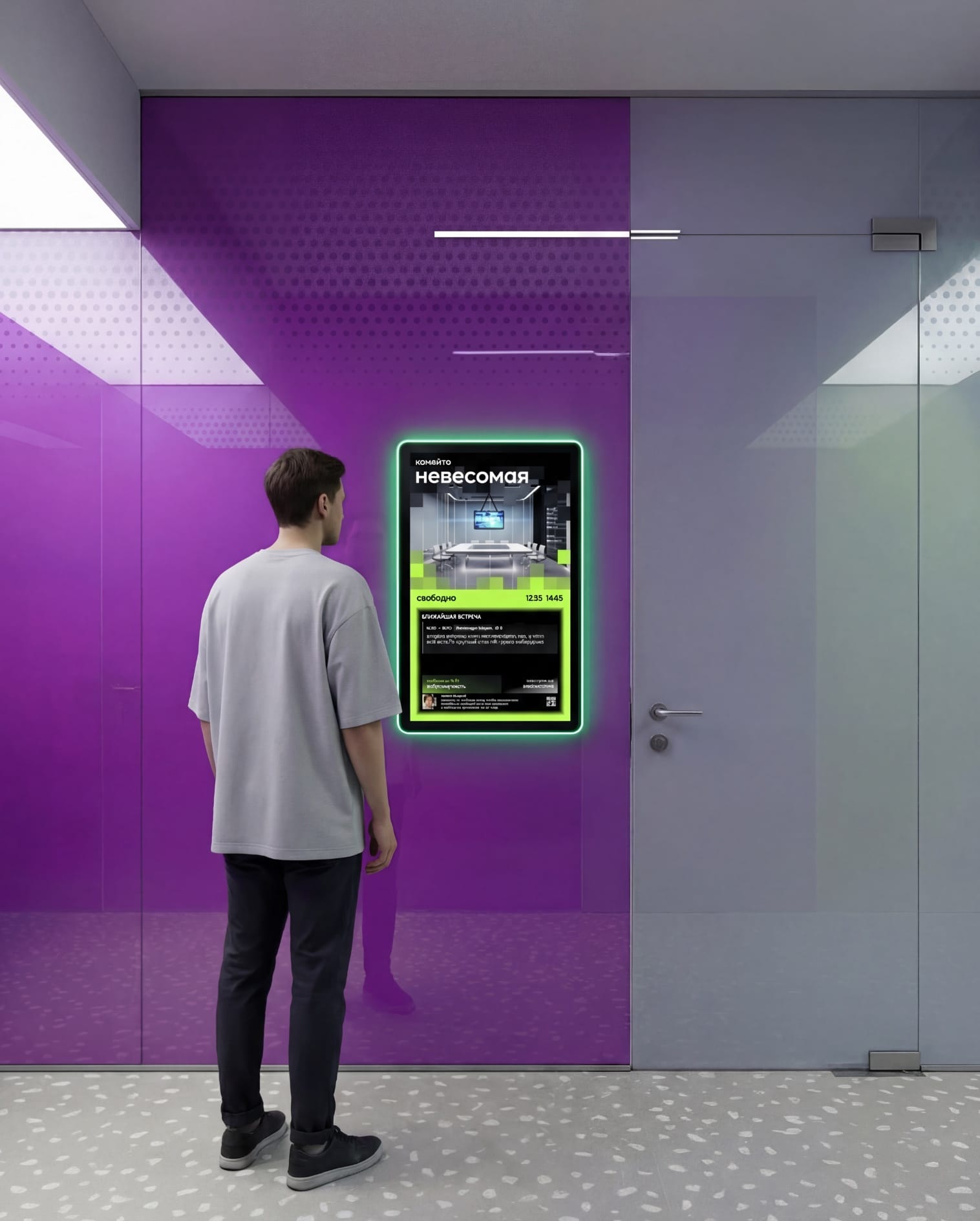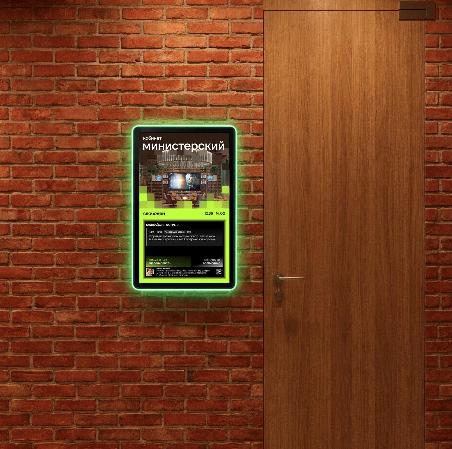 Сразу после идентификации резиденту доступны сценарии бронирования: можно быстро занять переговорную, открыть полное расписание на день и запланировать встречу в нужный слот — прямо на месте, за несколько касаний. Для чувствительных обсуждений предусмотрен приватный режим, в котором встреча скрывается из общего расписания.